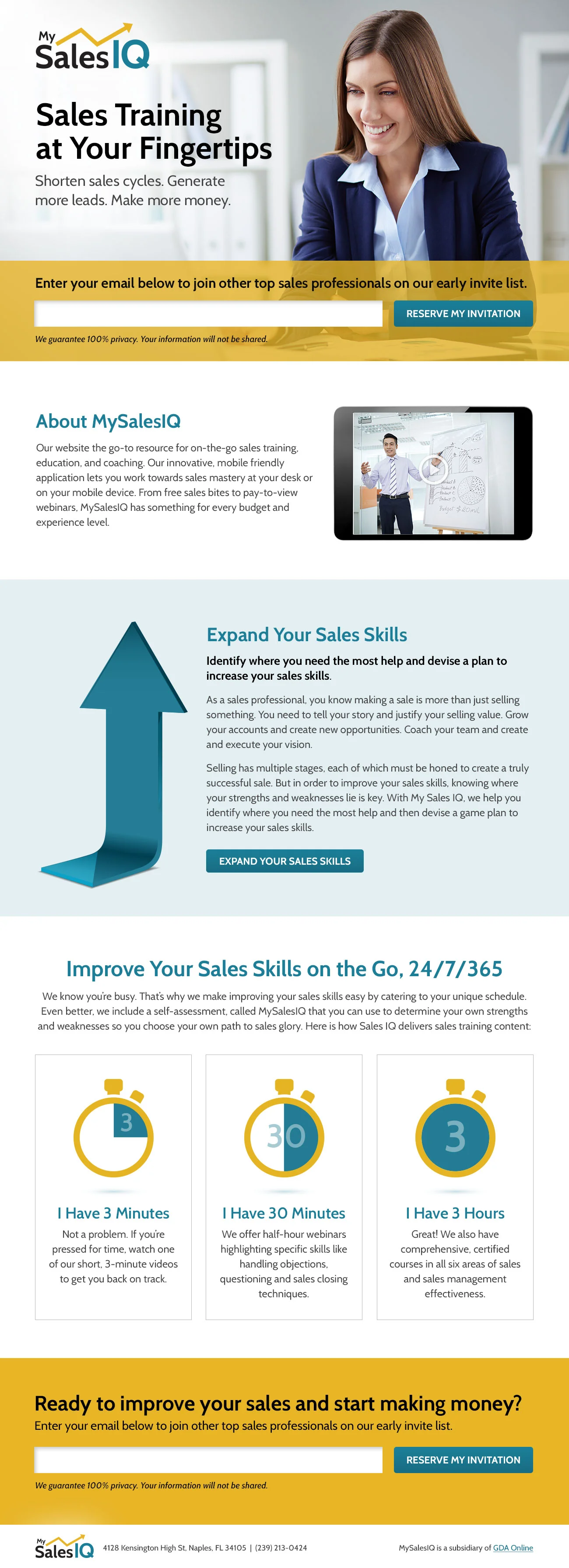 Growth Development Associates Inc. (GDA) is a privately owned sales training and sales management consulting firm. Through fully customized solutions, delivered by experienced sales training and management professionals, GDA integrates proven sales training methodologies that give organizations the best opportunity to achieve record level growth. Our goal was to announce GDA's latest product, MySalesIQ, and to get users to subscribe to the early-invite list for the MySalesIQ product launch.